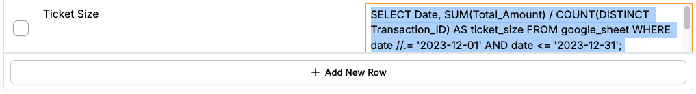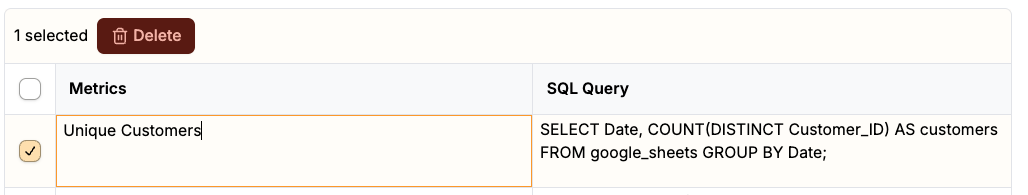 - Fill in the Friendly Name of the metric and the SQL to pull it from your data source, then hit “Update Metric”.